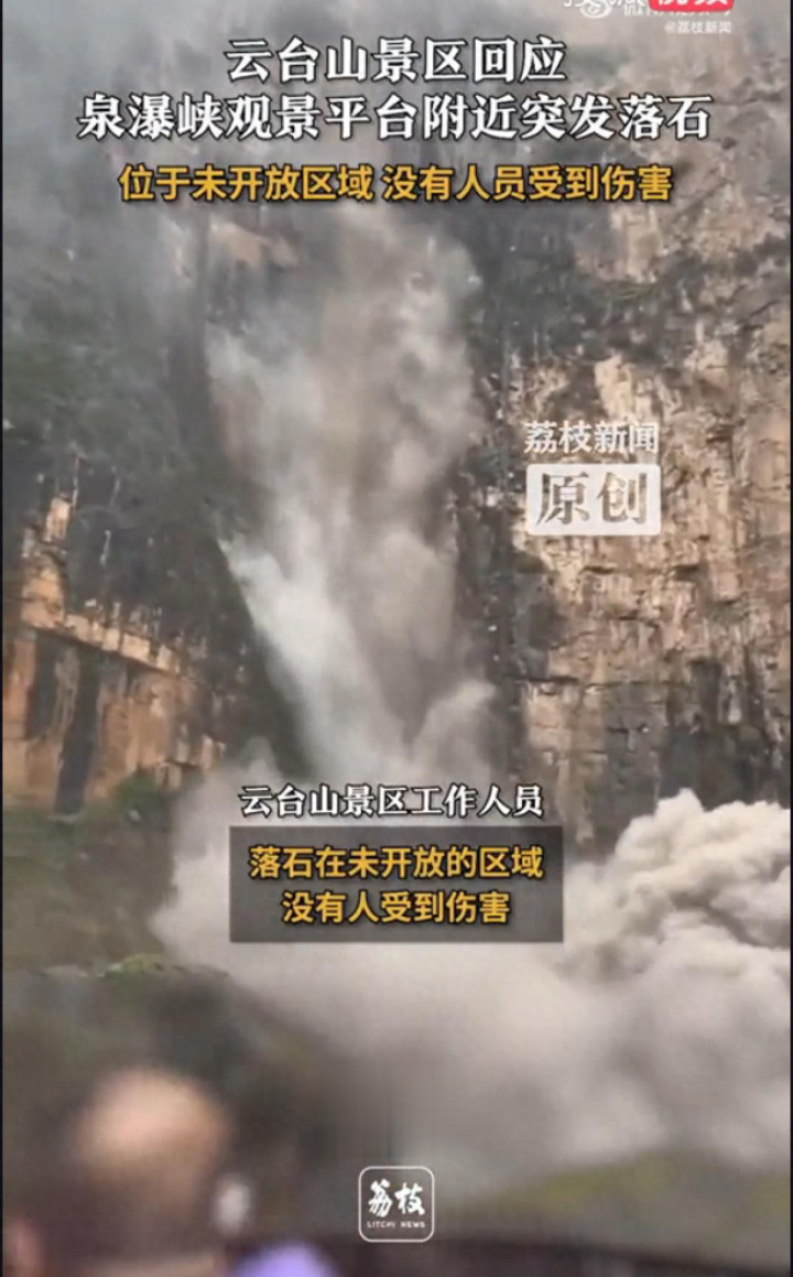 10月5日,有网友发视频称云台山景区发生山体滑坡落石,现场升起巨大灰尘,游客纷纷远离。景区工作人员回应称,确有发生落石,落石在未开放的区域,没有人受到伤害,泉瀑峡是因为水太大了,暂时不开,其他景点正常开放。